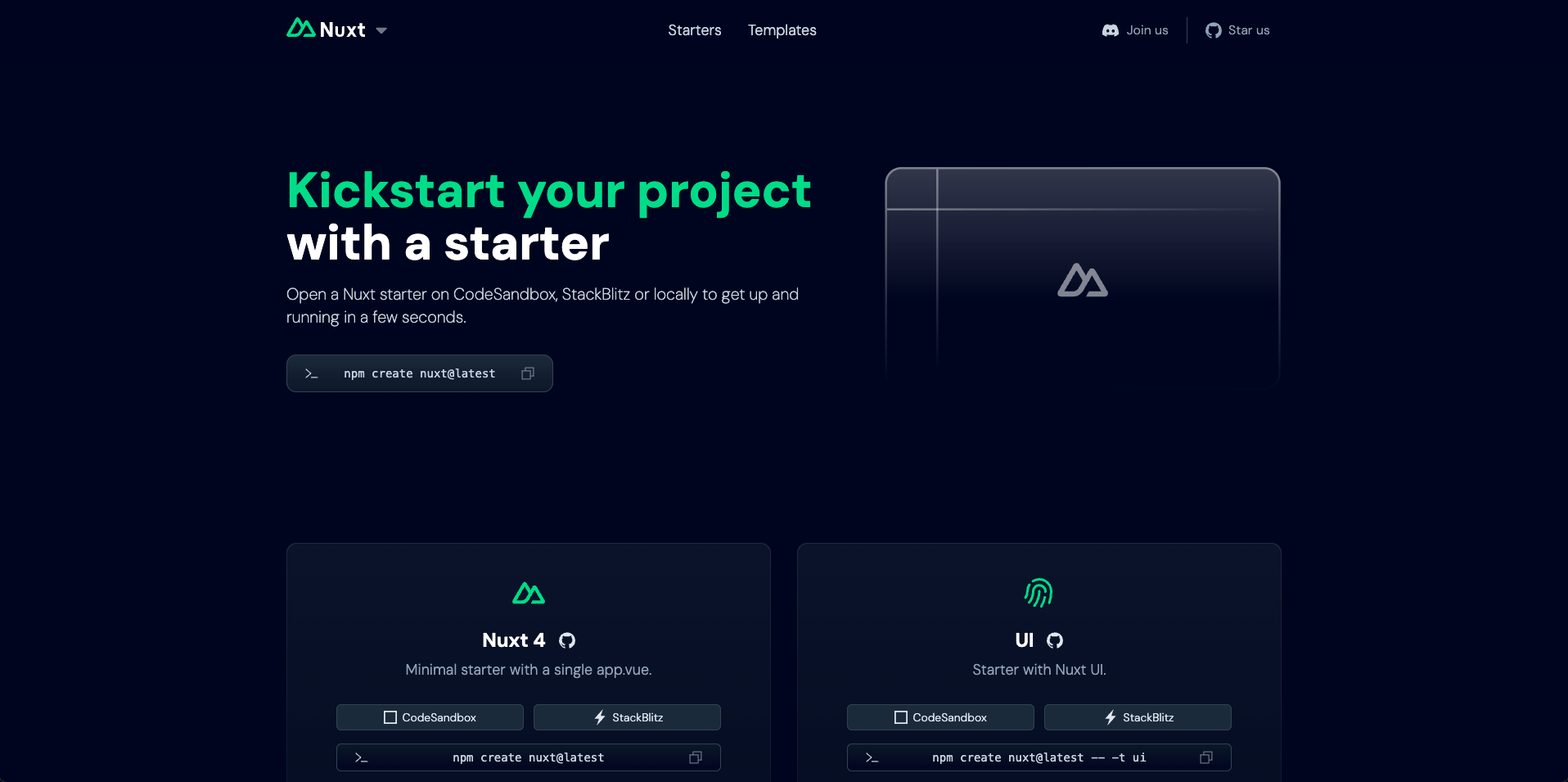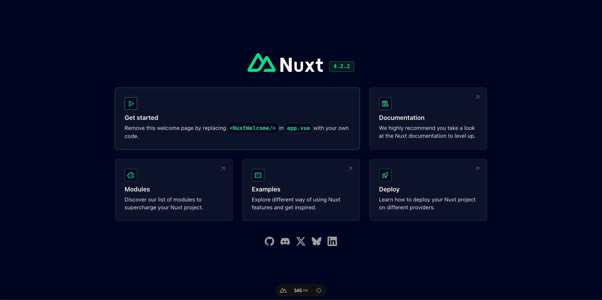 npx nuxi@latest init <project-name>Creating a new Nuxt app is as simple as running the following command: